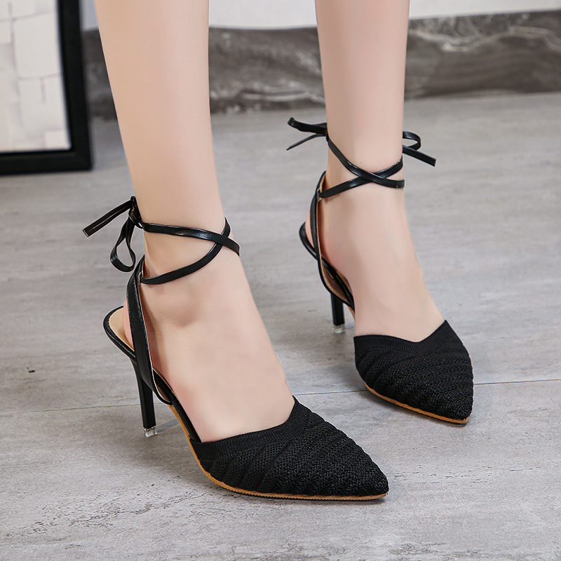 Pointed Toe Stiletto Solid Color Flying Knit Korean Style Women's Sandals