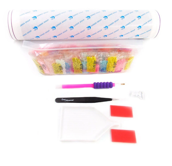 Canvas, rhinestones, bag, tweezers, plates, pens and glue.