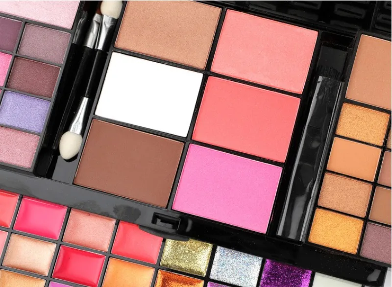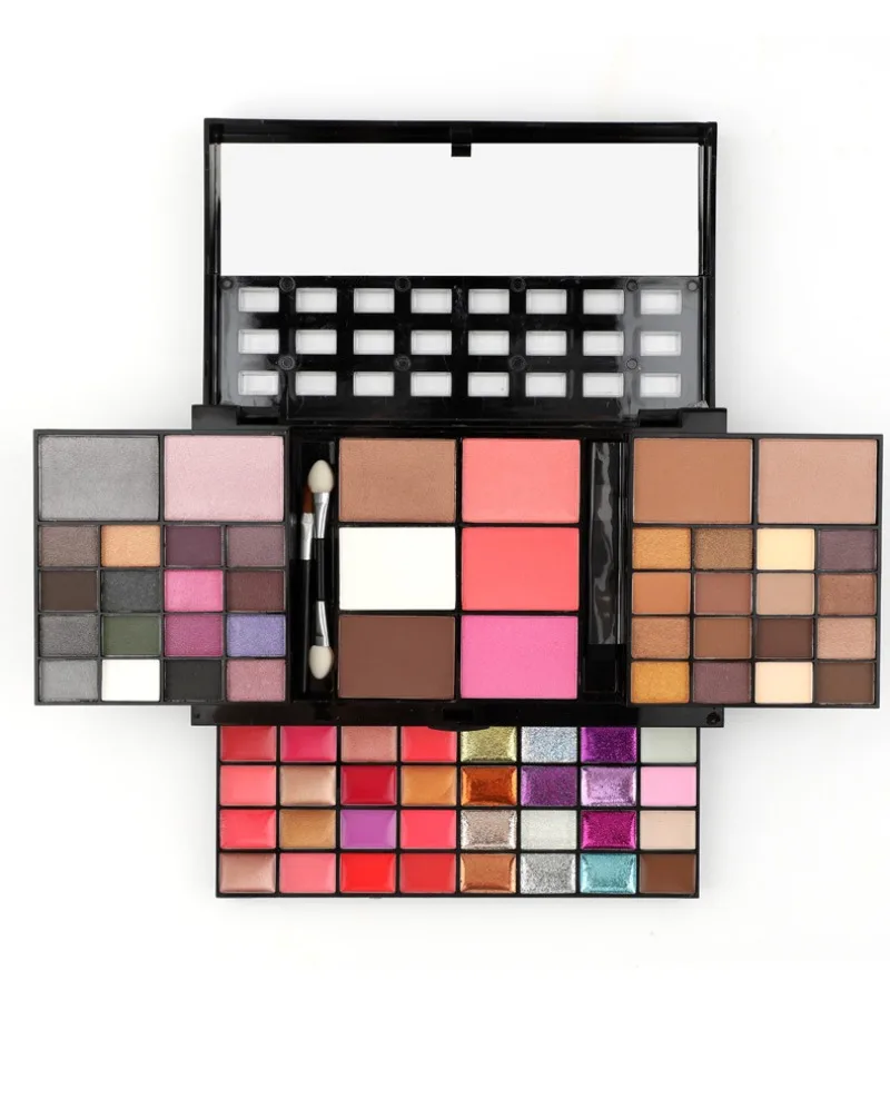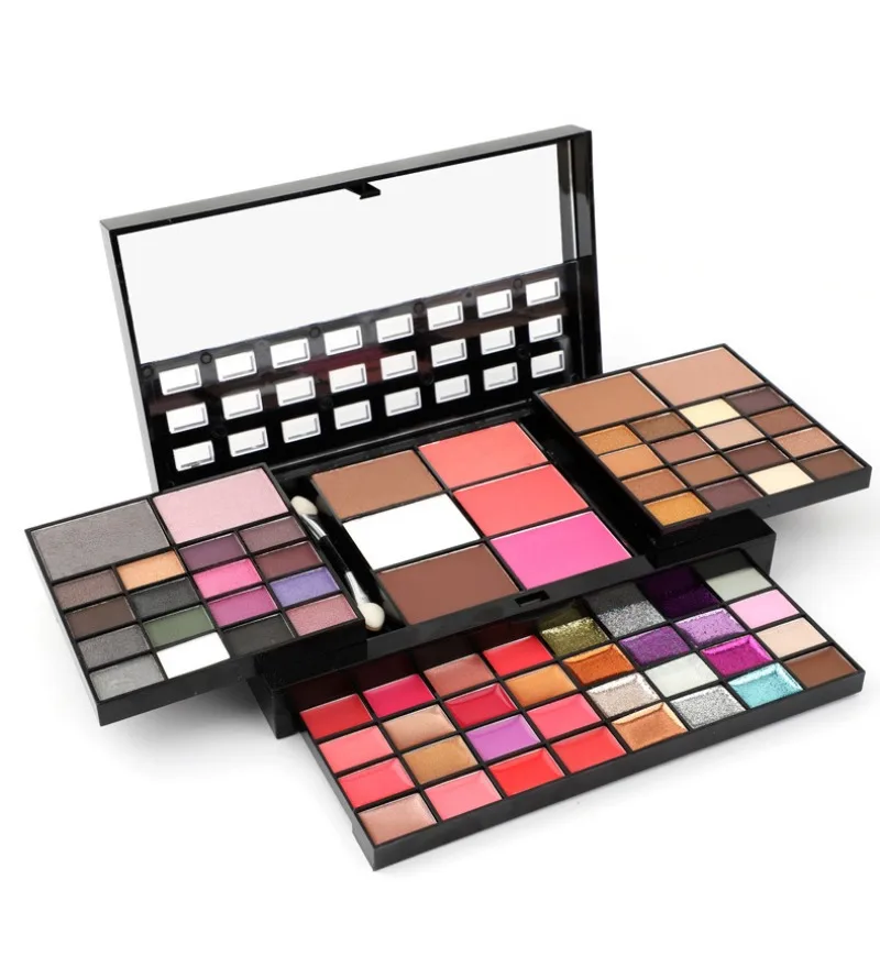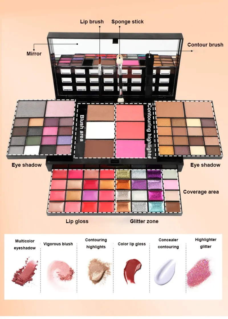 Products are powder products,74 different colors (including 36 colors of eyeshadow, 28 colors of lip gloss (with 12 lip jelly with glitter), 4 colors of concealer, 3 colors of blush, and 3 colors of contouring powder). Eyeshadow 80% matte,20% pearlescent.4 layers powder plate with mirror,1 double-ended sponge eyeshadow stick,1 Contouring brush,1 lip brush, mirror plastic outer case. Each powder plate adopts a three-dimensional drawing type, novel appearance, is exquisite, and is convenient to carry!