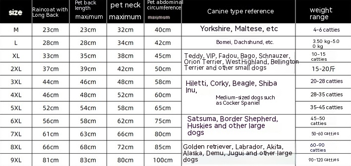 5. Dog raincoats are available in 10 sizes, suitable for all types of dogs. Before placing an order, please accurately measure your pet's bust.
