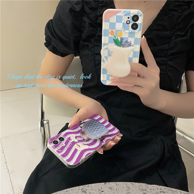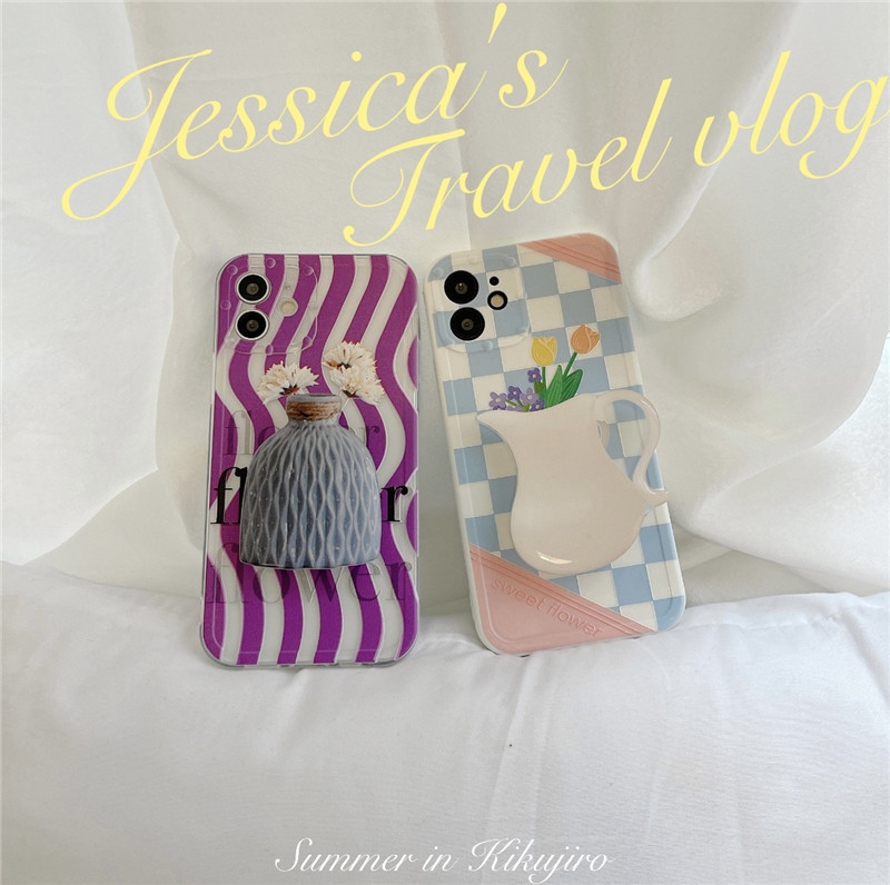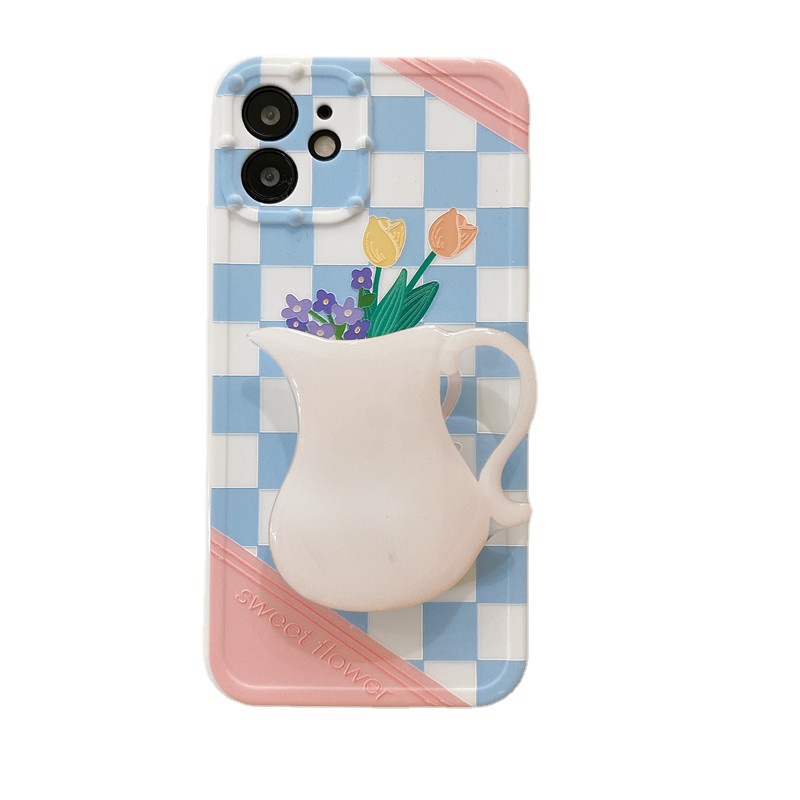 Color: purple striped flower+vase holder, pink blue checkerboard+white vase holder