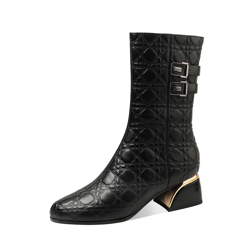 Thick-heeled Mid-heel Mid-high Boots Women Plus Velvet Warmth Cowhide Knight Boots Fashion Belt Buckle