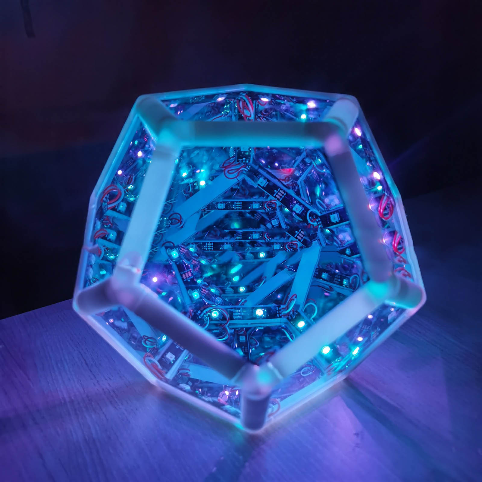Infinite Dodecahedron uses the unique properties of light to give the viewer the feeling of gazing into the endless abyss of geometry and color.
