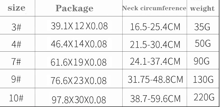 Specifications: 3#: suitable for neck circumference 16.5-25.4cm (recommended within 8 kg), 4#: suitable for neck circumference 21.5-30.4cm (recommended 8-15 kg), 7#: suitable for neck circumference 24.1-37.4cm (recommended 15 —25 kg), 9#: suitable for neck circumference 31.75-48.8cm (recommended 25-35 kg), 10#: suitable for neck circumference 38.7-59.6cm (recommended 35-60 kg)