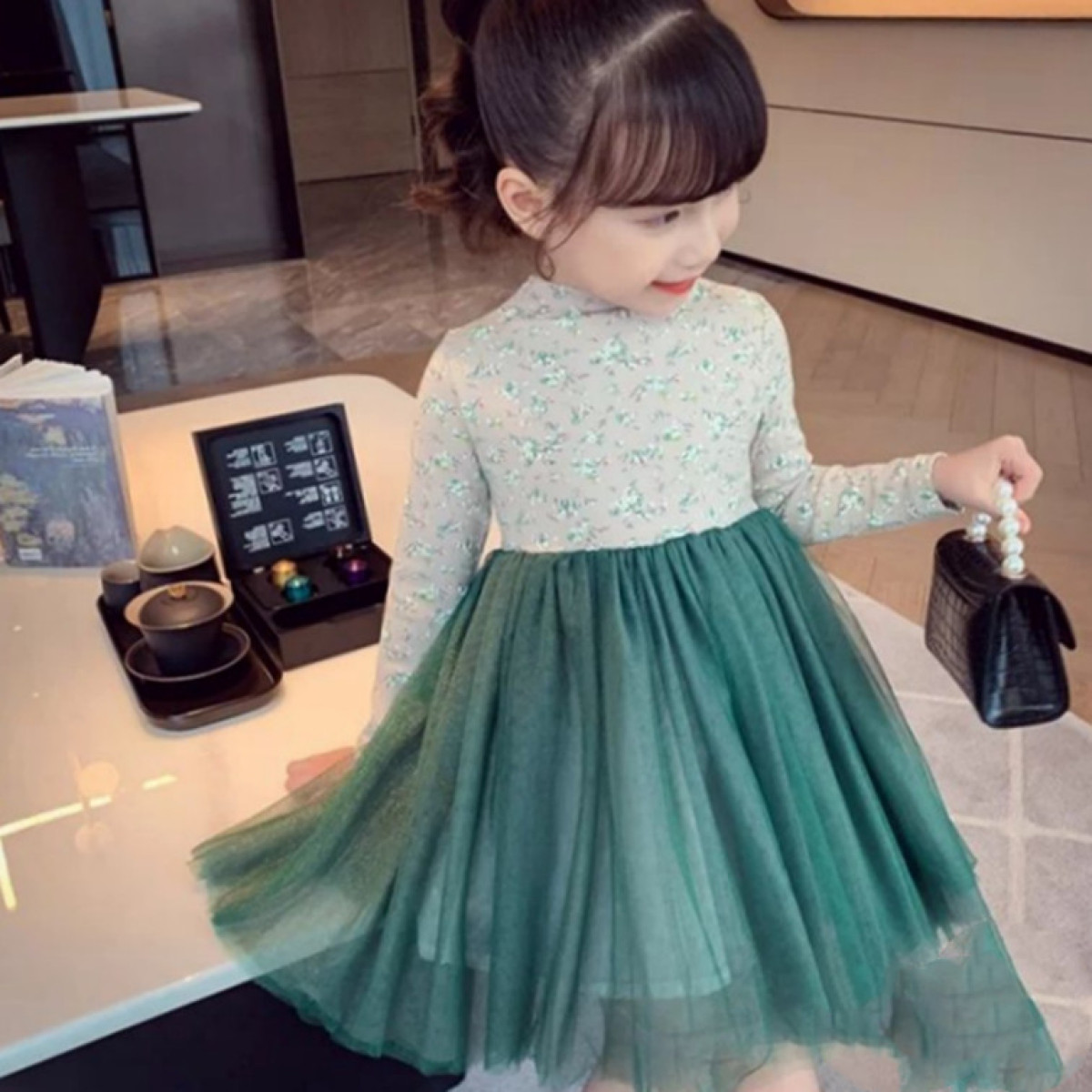 Color classification: dark gray floral skirt, green floral skirt