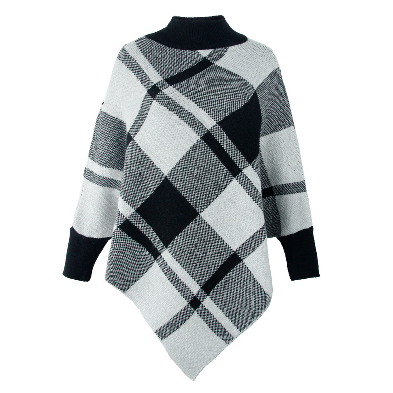 Color Block Check Cape Bat Sleeve Pullover Knit Shawl