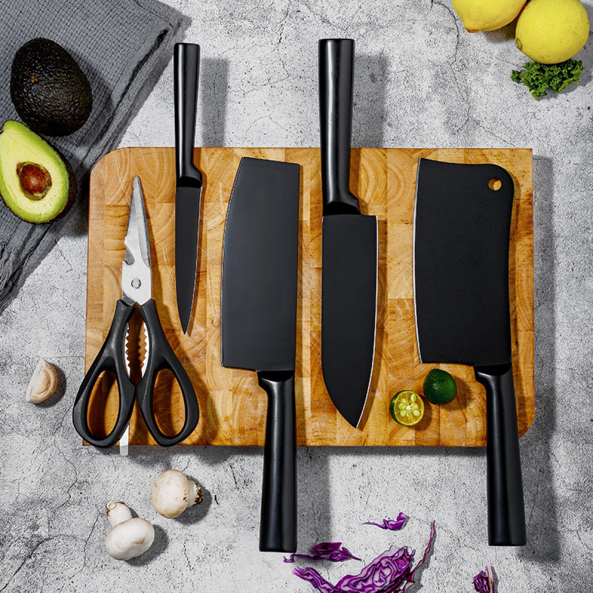 Specifications: six-piece color box, four-piece white box, knife holder color box, chopper, small kitchen knife, chef's knife, fruit knife, kitchen scissors