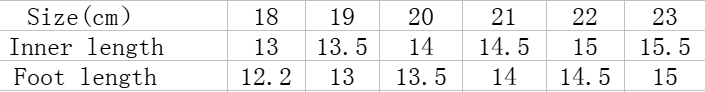 Size: 18 inner length 13.0/suitable foot length 12.5, 19 inner length 13.5/suitable foot length 13.0, 20 inner length 14.0/suitable foot length 13.5, 21 inner length 14.5/suitable foot length 14.0, 22 inner length 15.0/suitable foot length 14.5,23 inner length 15.5/suitable foot length 15.0