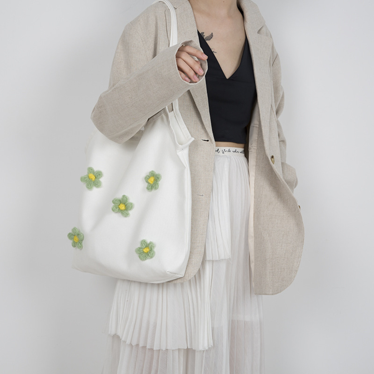 Color: Purple bag white flower, white bag orange flower, white bag green flower, yellow bag white flower, white bag yellow flower, green bag green flower, white bag purple flower