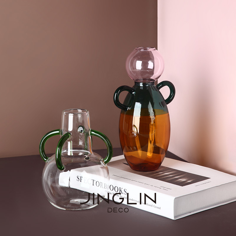 Color: Green glass vase with handle (13.5*11cm), amber glass vase with handle (17*13cm), stained glass double-ear vase (19*11cm)