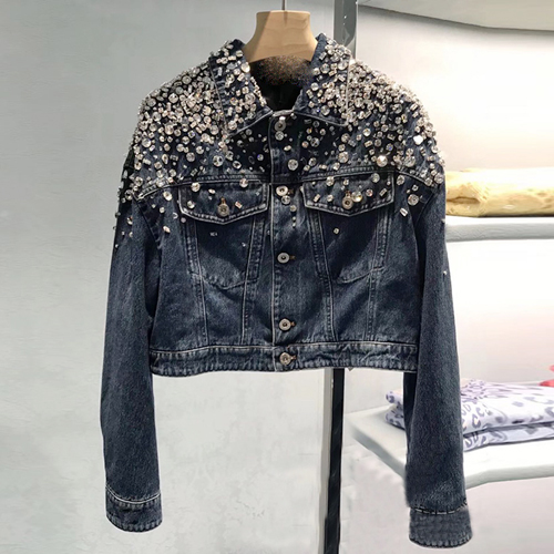Beaded And Diamond Long-sleeved Loose Denim Jacket