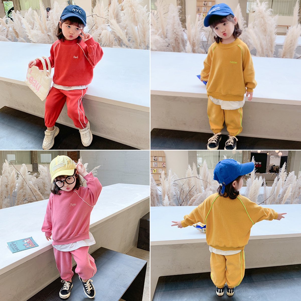 Color classification: red [coat+trousers] two-piece suit, red [sweatshirt+trousers] two-piece suit, pink[coat+trousers] two-piece suit, pink[sweater+trousers] two-piece suit