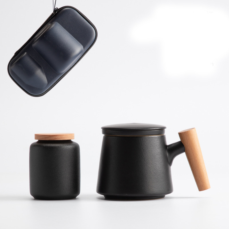 Style J: Elegant cup with wooden handle + tea caddy + travel bag [black],