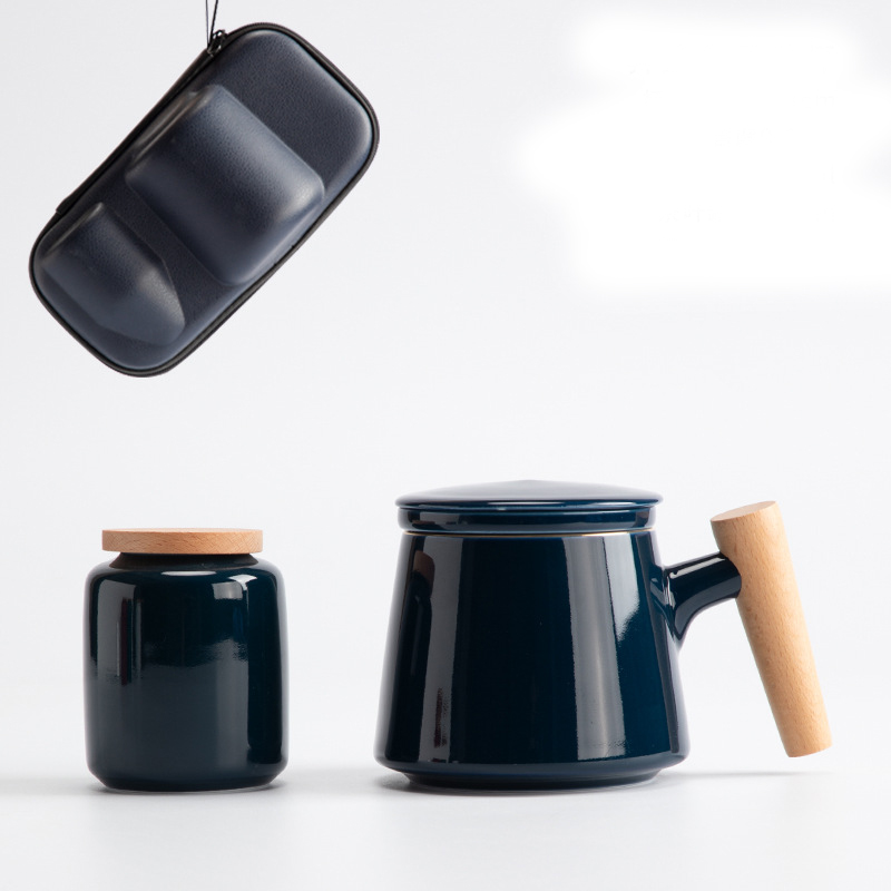 Style K: Elegant cup with wooden handle + tea caddy + travel bag [ji blue],