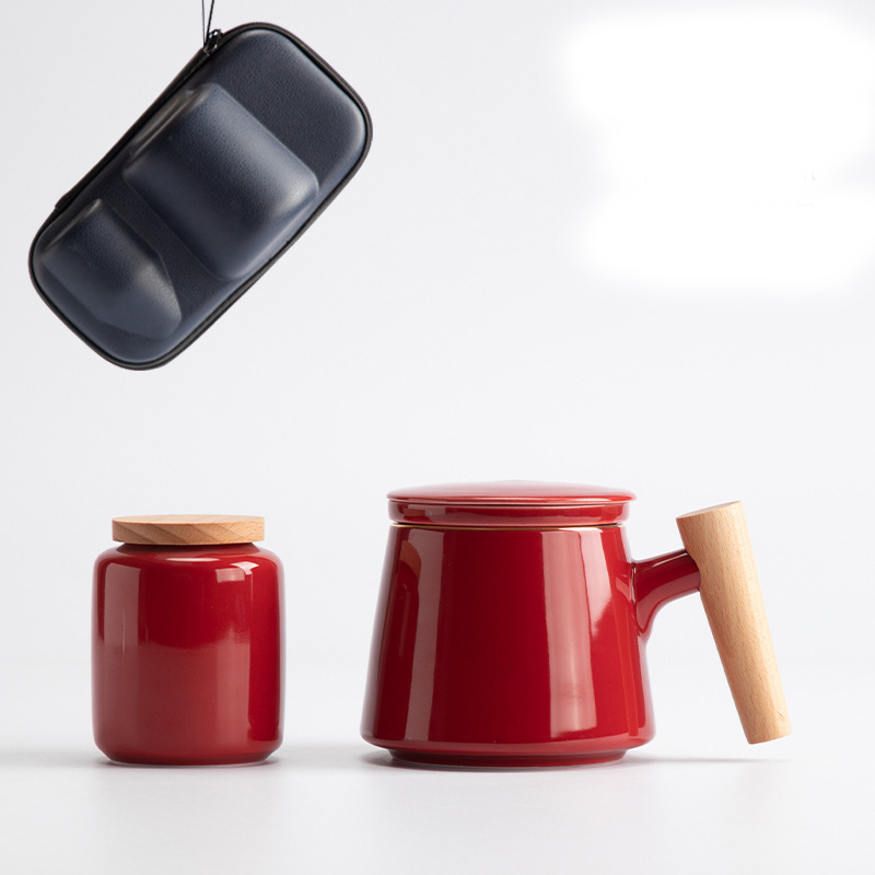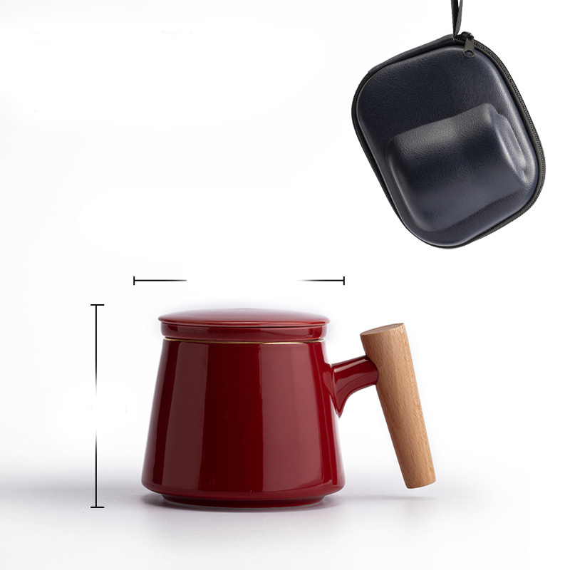 Style L: Elegant Cup with Wooden Handle + Tea Caddy + Travel Bag [Wine Red],
