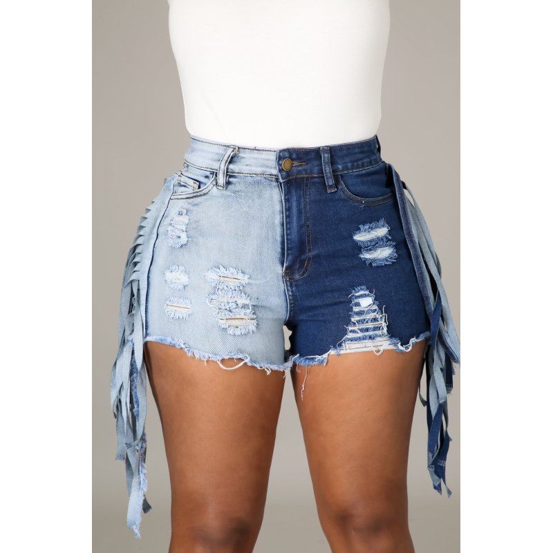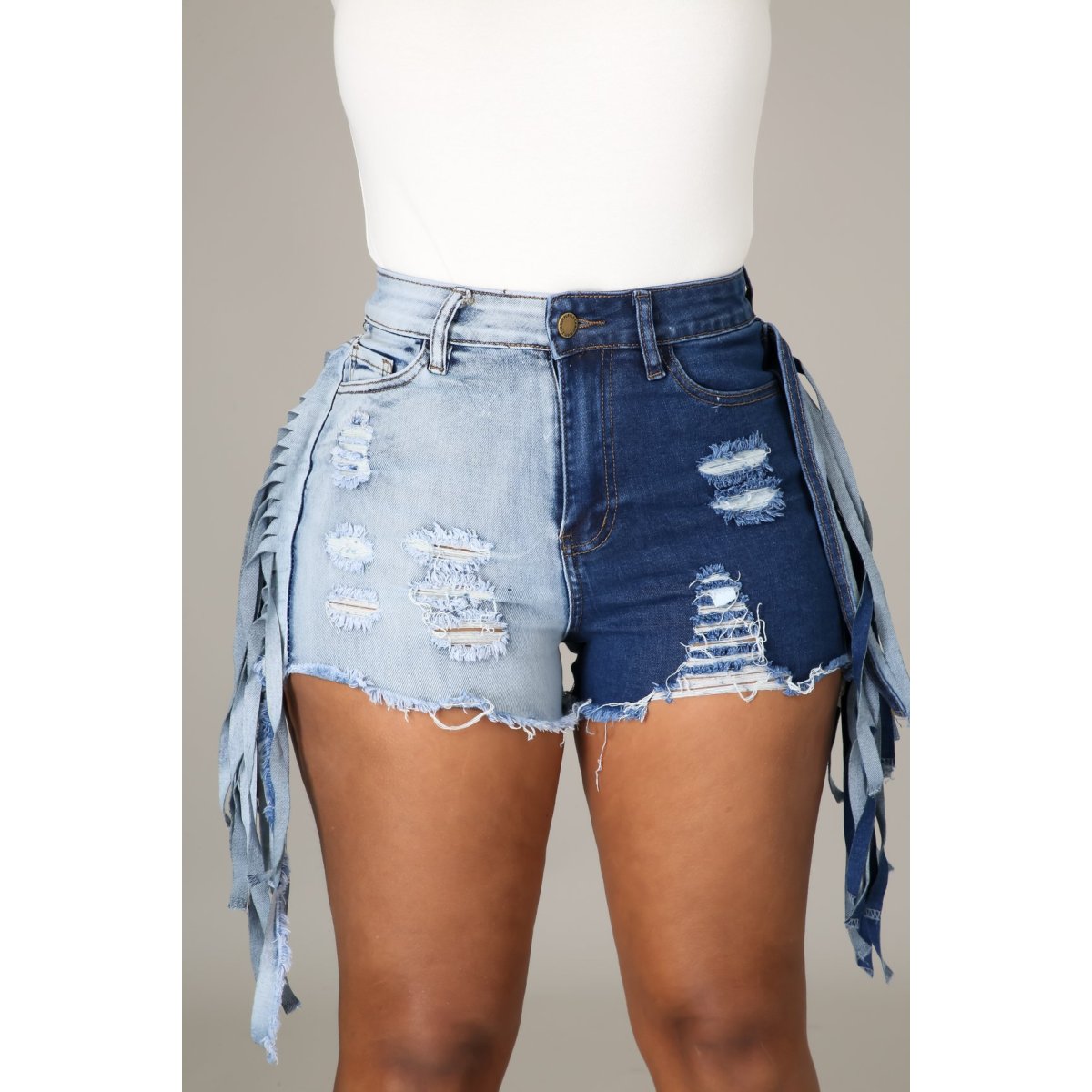 SHEIN SXY Two Tone Fringe Trim Raw Hem Denim Shorts