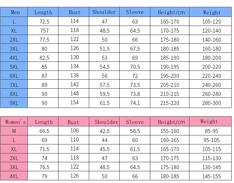 Size: M, L, XL, XXL, XXXL, 4XL, 5XL, 6XL, 7XL, 8XL, 9XL