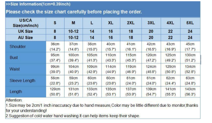 2. Please check the size chart carefully before you buy the item, if you don't know how to choose size, please contact our customer service.
