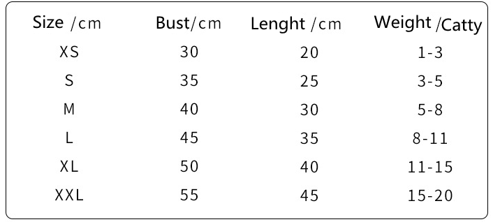 Size: XS (recommended weight 1-3 catties), S (recommended weight 3-5 catties), M (recommended weight 5-8 catties), L (recommended weight 8-11 catties), XL (recommended weight 11-15 catties ), XXL