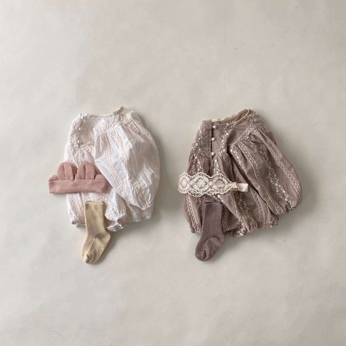 Color: Beige pearl button embroidered long-sleeve romper, swallow grey pearl button embroidery long-sleeve romper