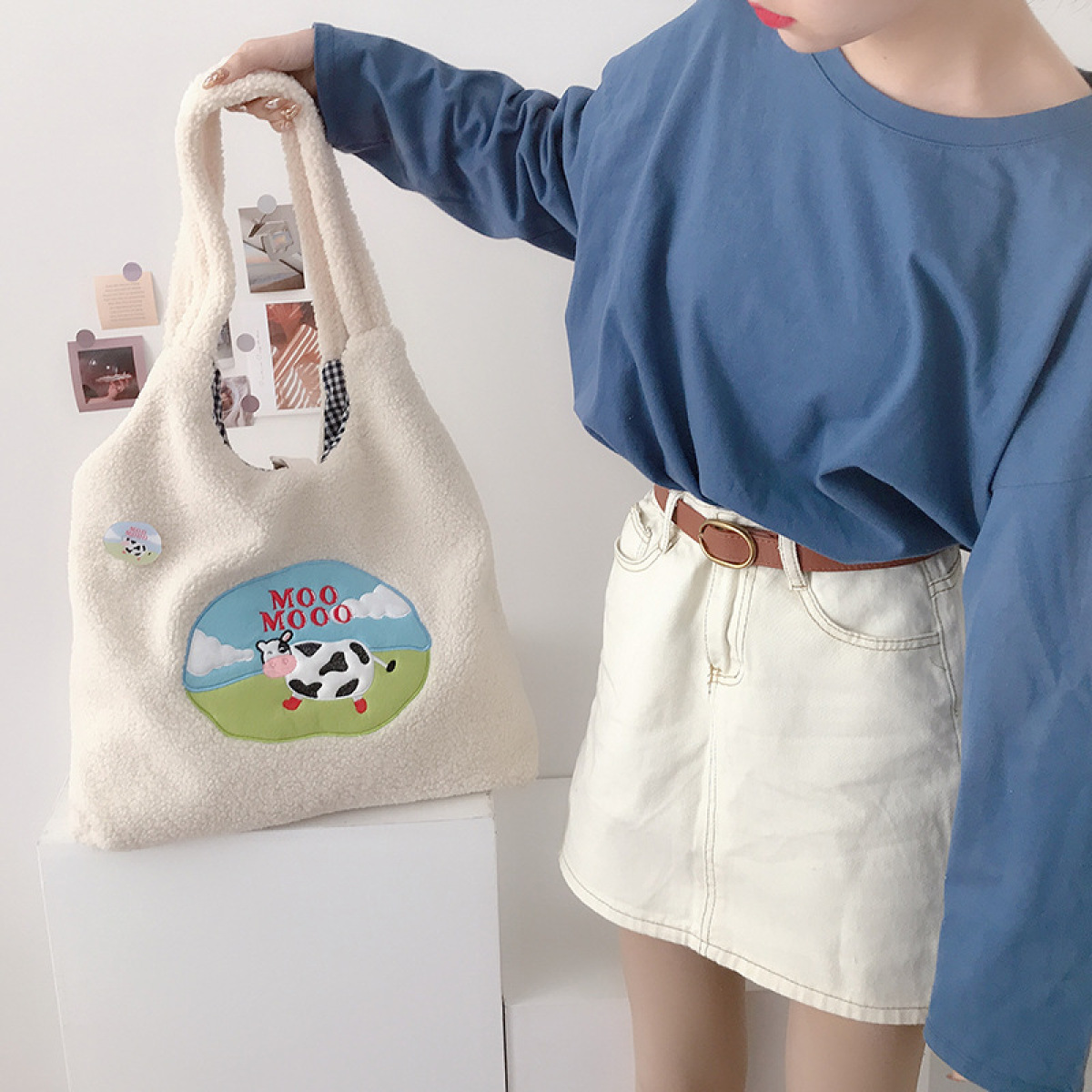 Color : Moo Cow Embroidered Lamb Fleece Large Capacity