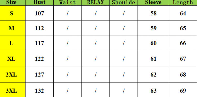 Size:S,M,L,XL,2XL,3XL unit:cm