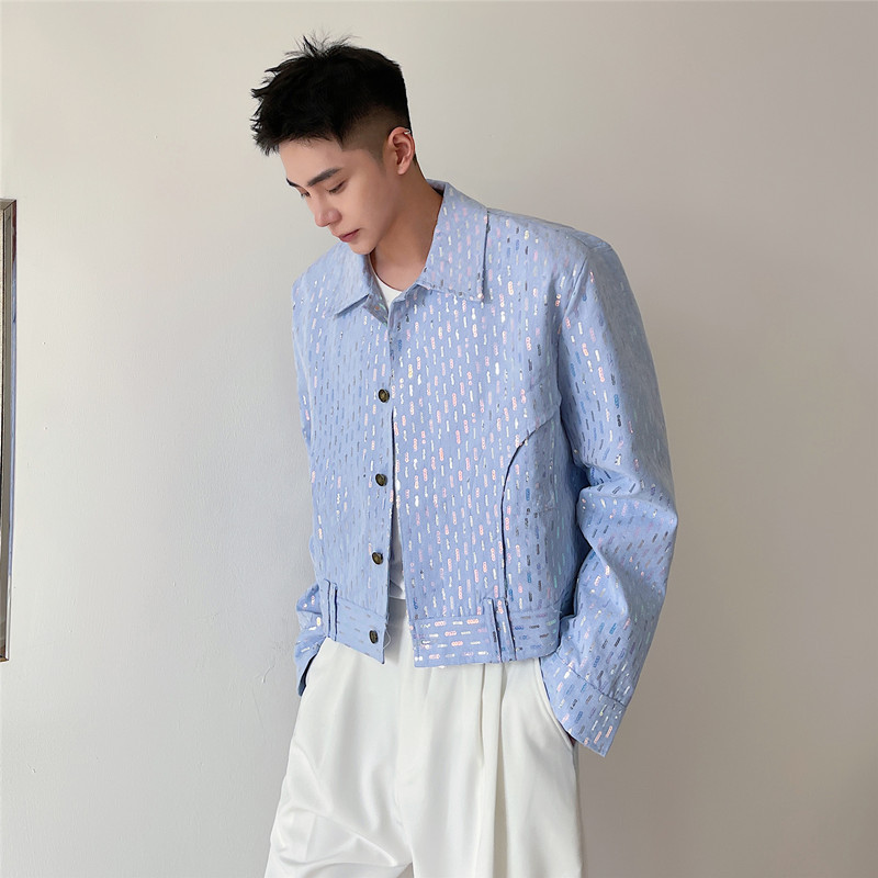 Men's Blue Cropped Jacket With Fried Street Pearl Sequin Lapel