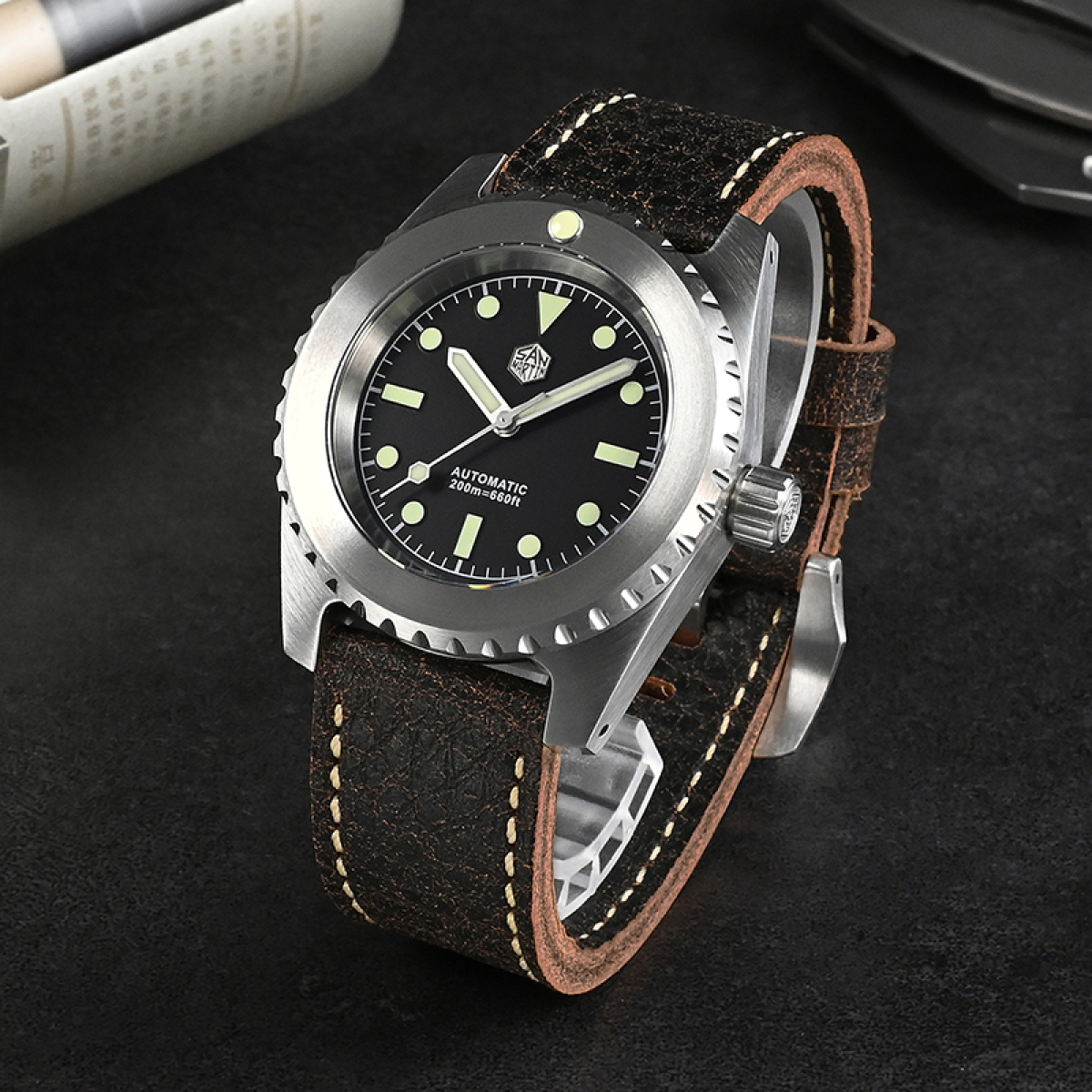 Dial: Matte black, oil-embossed luminous hour markers