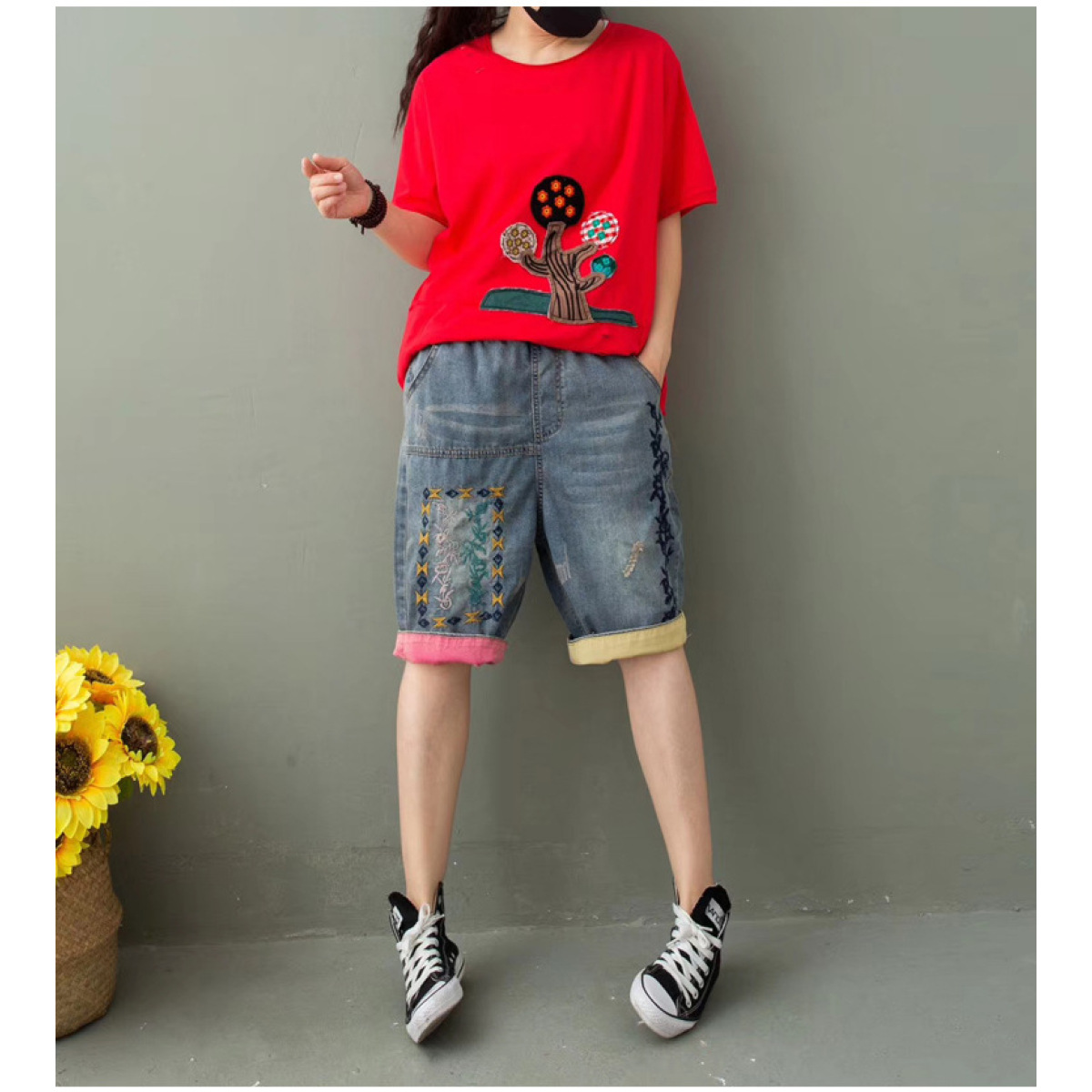 Women's Summer Ethnic Style Embroidered Denim Five-point Pants