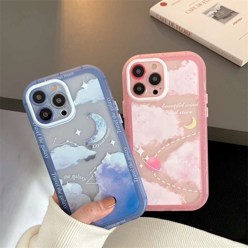 Color: pink edge cloud moon planet, blue purple edge cloud moon starry sky