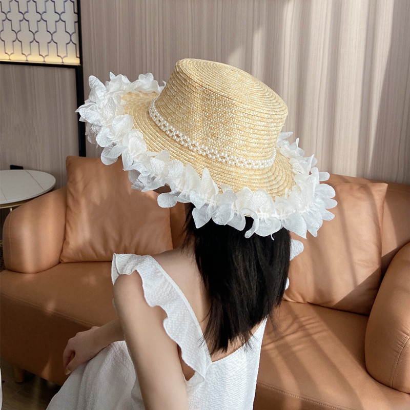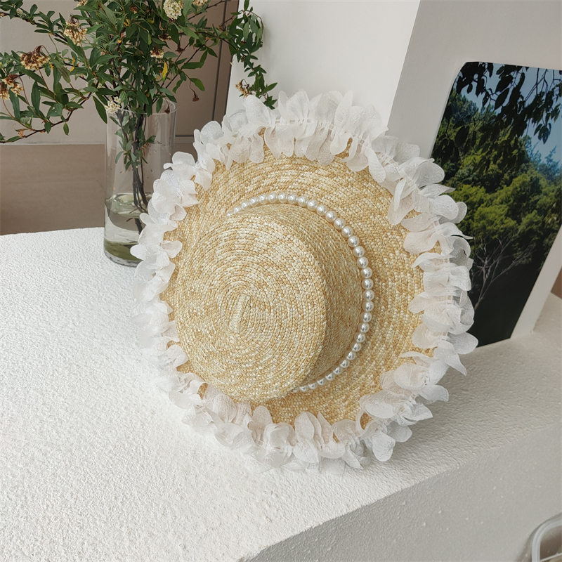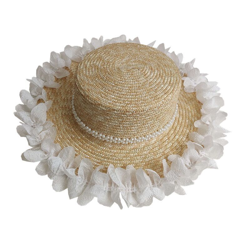 Colour: Hat top lace, single row of pearls + brim lace flowers, small pearls + brim lace flowers, large pearls + brim lace flowers