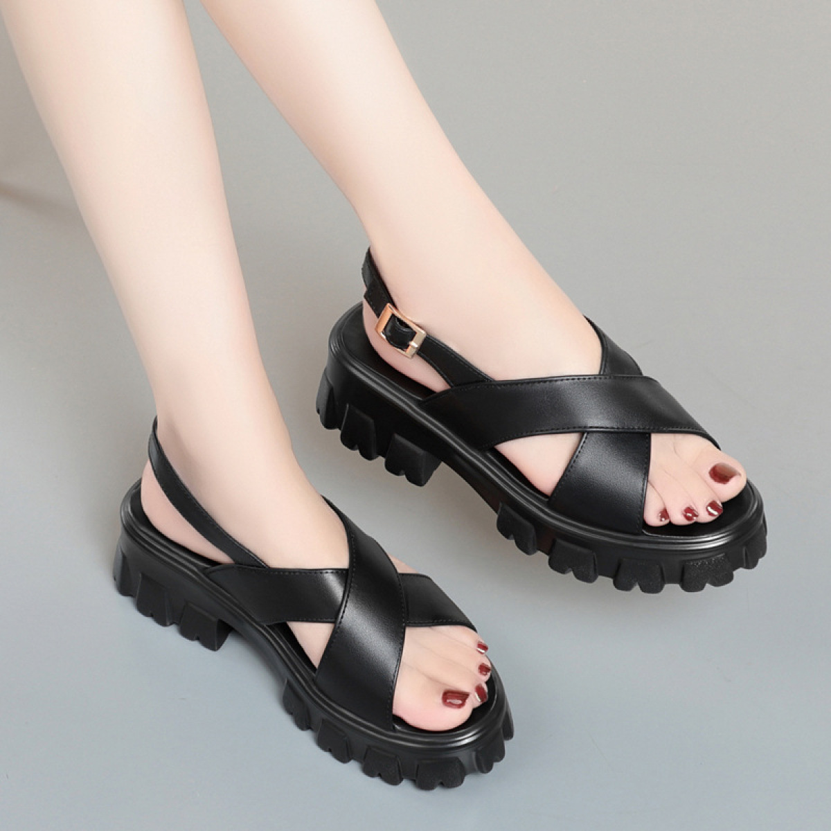 Popular elements: metal, sewing thread, T-strap, wedge heel, buckle