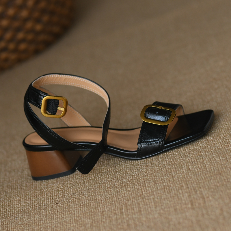 Popular elements: shallow mouth thick heel metal belt buckle