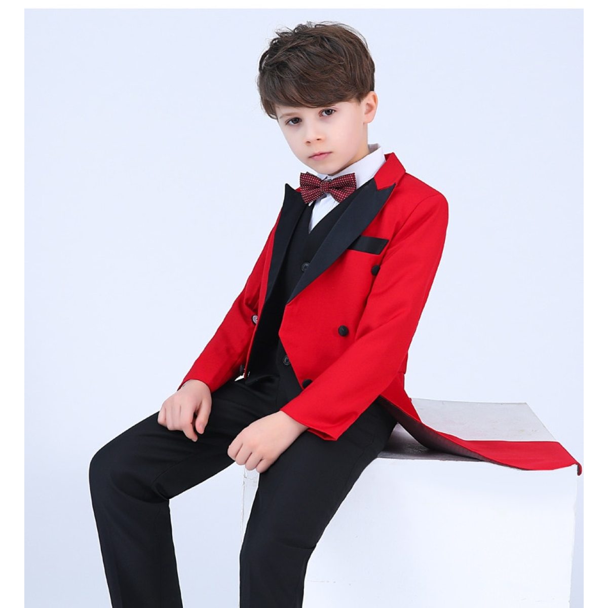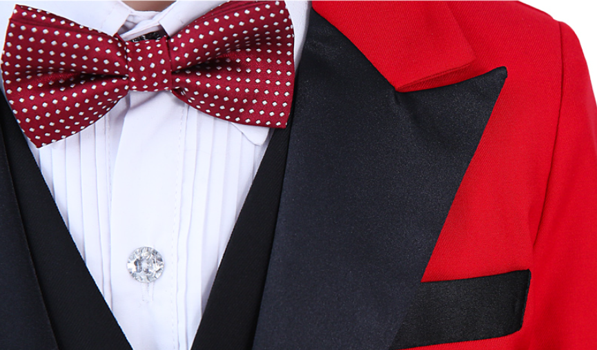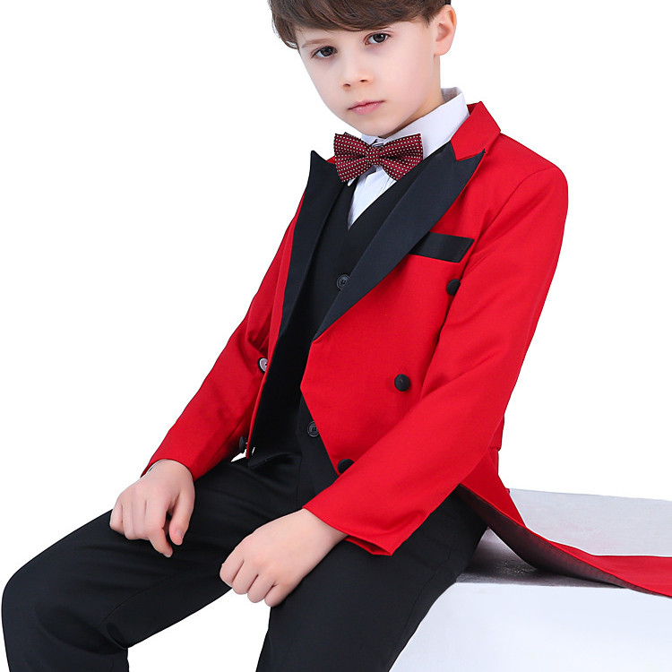 Color: 4-piece black dovetail set (black jacket + black pants + shirt + bow tie), 5-piece black dovetail set (black jacket + black vest + black trousers + shirt + bow tie), 4-piece red dovetail set (red jacket + black trousers) + shirt + bow tie), red dovetail 5-piece set (red jacket + black vest + black pants + shirt + bow tie)
