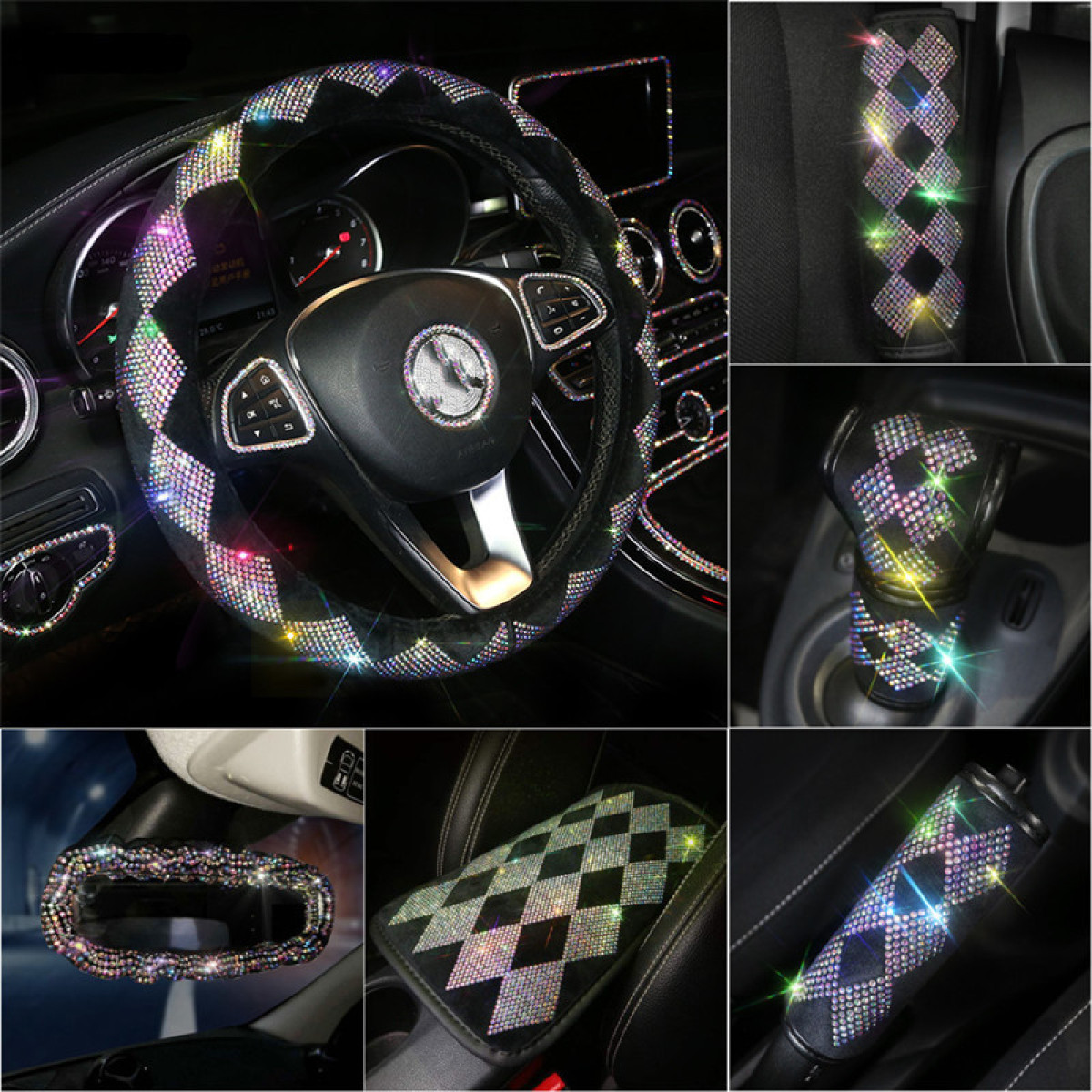 Color: colorful crystals rhombus steering wheel cover, colorful crystals rhombus shoulder pad [pair], colorful crystals rhombus handbrake [single], colorful crystals rhombus gear [single], colorful crystals rhombus armrest pad [large], colorful crystals rear view mirror cover, colorful crystals Diamond hook [single]]