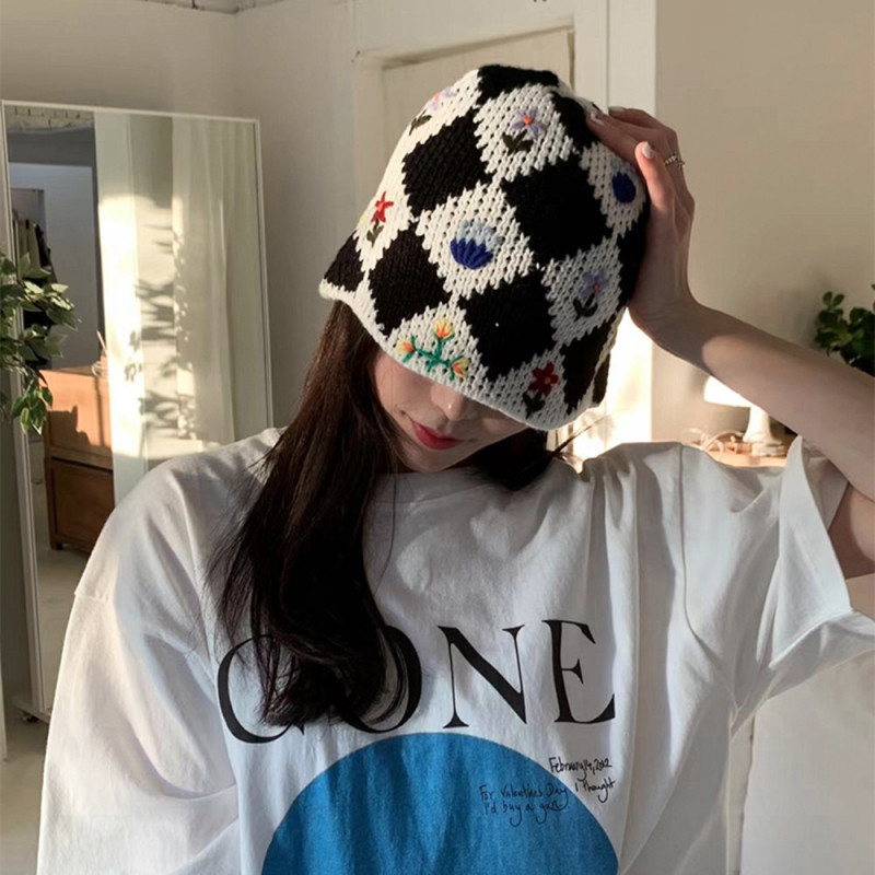Diamond Check Flower Embroidered Knit Fisherman Hat