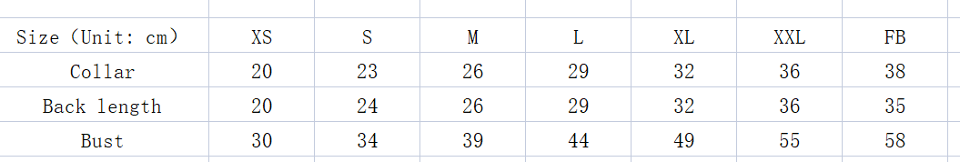 Size: XS [chest circumference 30 back length 20], S [bust circumference 34 back length 23], M [bust circumference 38 back length 26], L [bust circumference 43 back length 29], XL [bust circumference 49 back length 32], 2XL [bust circumference 32] 52 back length 37], FB [bust 58 back length 35]