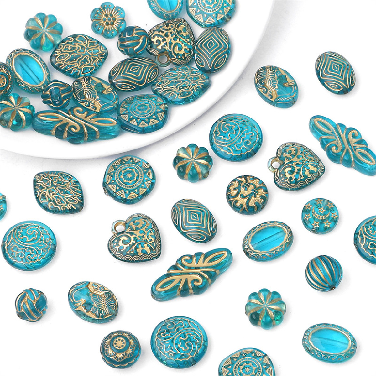 Color: woven flat beads 30 PCs/bag, long diamond pattern 15 PCs/bag, small round flower 20 PCs/bag, plum blossom 45 PCs/bag, flat round beads 25 PCs/bag, star and moon flat beads 35 PCs/bag, buds 80 pcs/bag, Sun totem 20 PCs/bag, flat circular engravure 15 PCs/bag, fat diamond carving 20 PCs/bag, return line flat beads 20 PCs/bag, beauty head 20 PCs/bag, Magic Mirror 25 PCs/bag, eight-petal flower 30 PCs/bag, leaf pattern love 20 PCs/bag, watermelon beads 20 PCs/bag