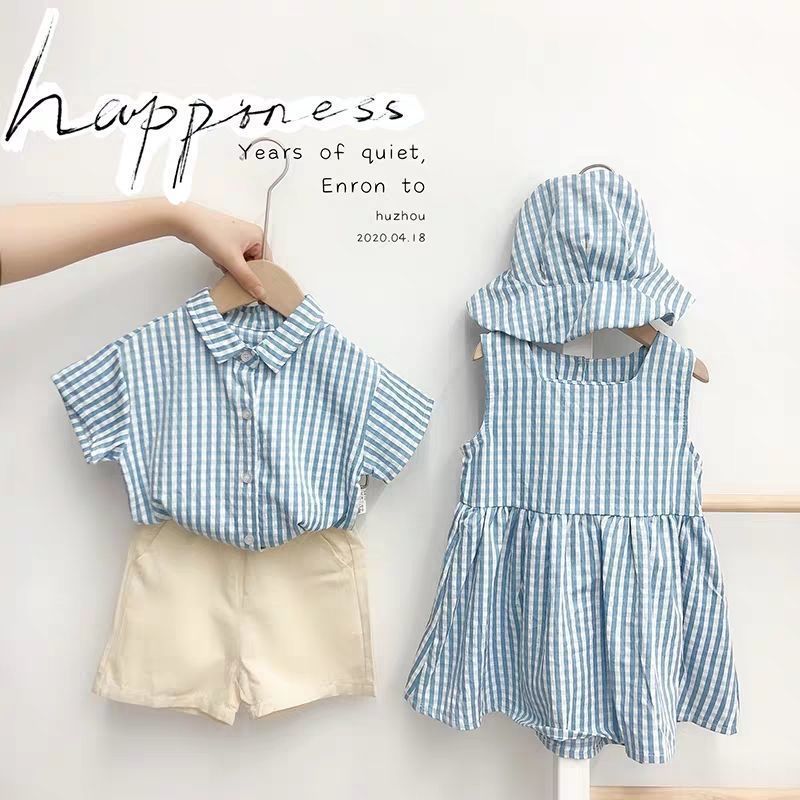 Color: blue and white plaid baby girl dress, blue and white plaid baby boy suit