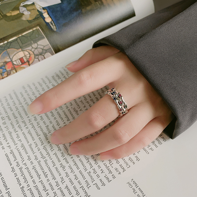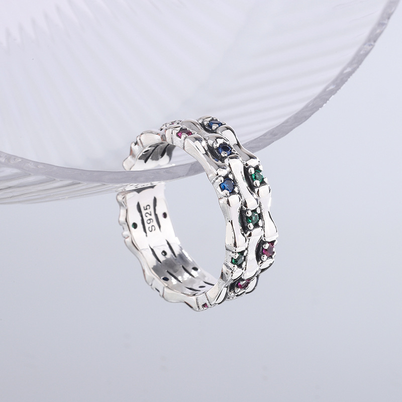 S925 Sterling Silver Color Diamond Zircon Bamboo Ring