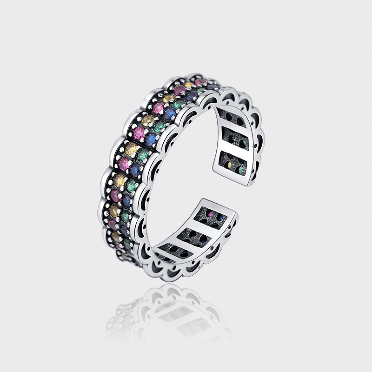 S925 Sterling Silver Vintage Heavy Industry Colorful Diamond Rainbow Ring