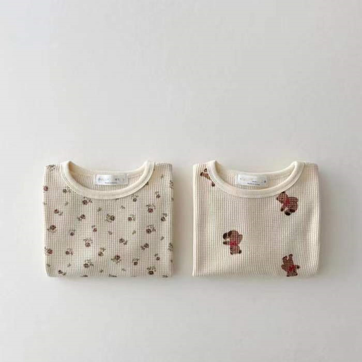 Color: beige cartoon bear waffle T-shirt, beige floral waffle T-shirt