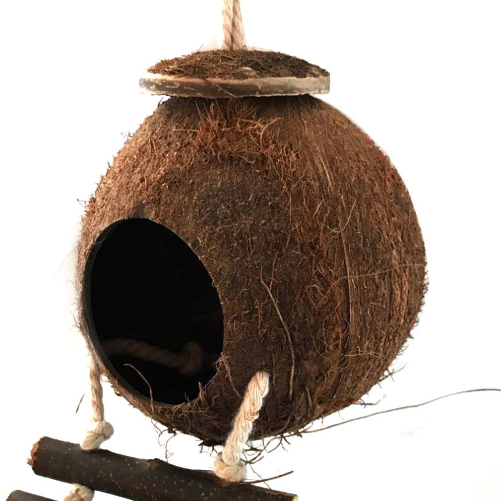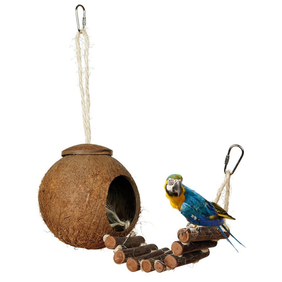 The natural vertical total length is about 67cm, the ladder is 10cm wide, and the whole set weighs about 335g. The coconut shell and the ladder are all natural with fur and have not been treated. The size of the coconut shell is variable. The diameter of the coconut shell is mainly 10-15cm. It is suitable for small pets such as parrots and squirrels. It can be used as a nest and also bring entertainment skills, so that the pet can play freely at the door