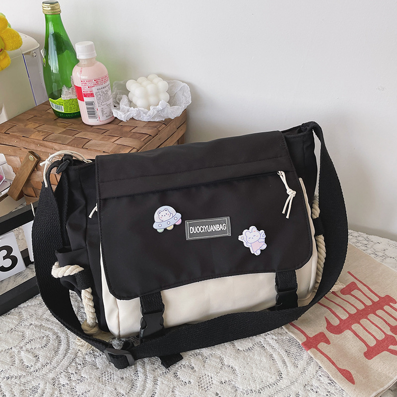 Popular elements: retro, letters, contrasting colors, postman, stitching