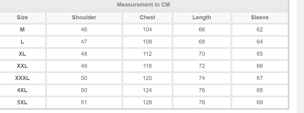 Sizes: M,L,XL,XXL,XXXL,XXXXL,5XL