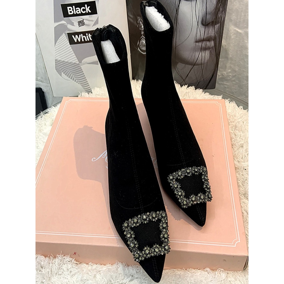 Rhine-drill Pointed High Heels Square Buckle Elastic Boots Large Size Ankle Boots Low Heel