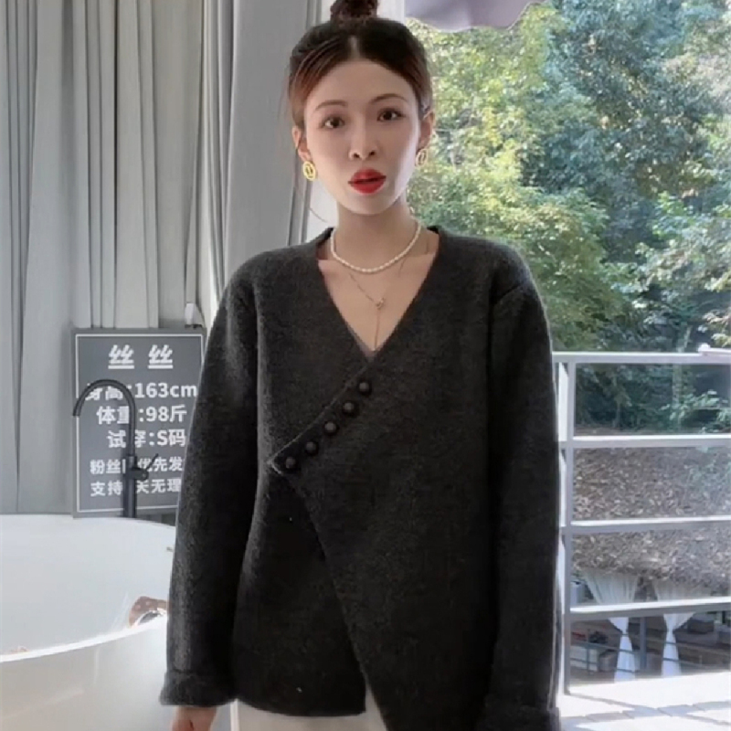 Ladies Fashion Irregular Diagonal Button Knit Sweater