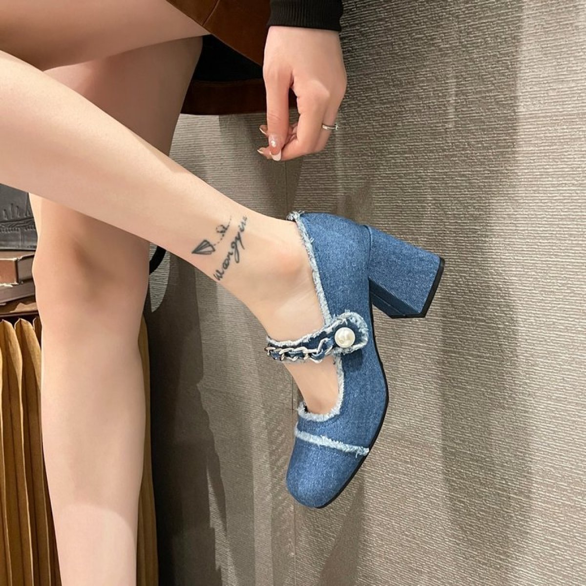 Denim Pearl Square Toe High Heels Women's Middle Heel Shoes