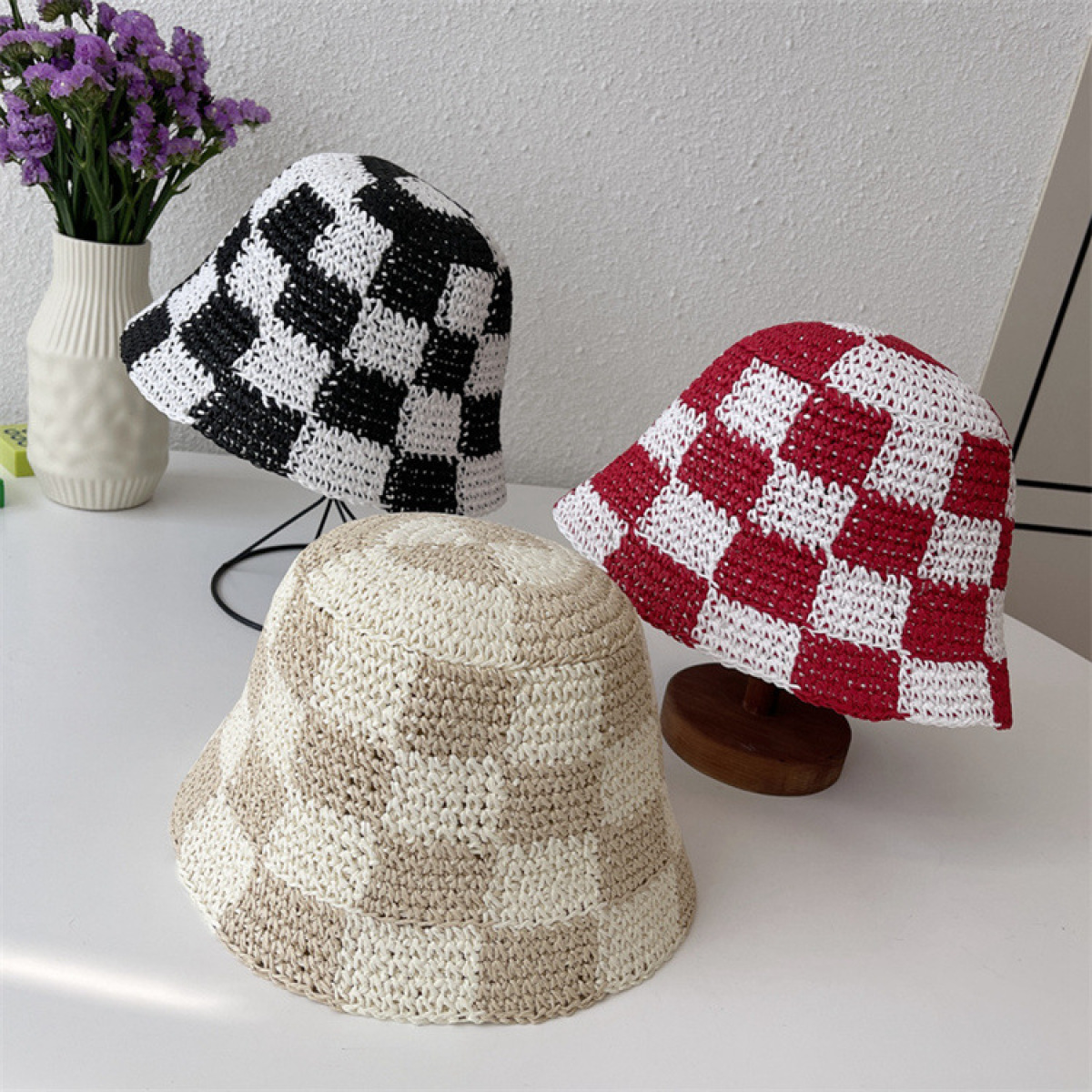 Checkerboard Plaid Coarse Wool Knitted Fisherman Hat Handmade For Women