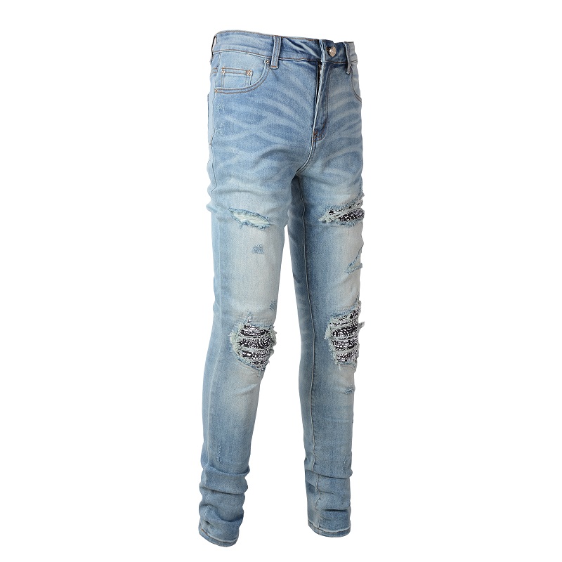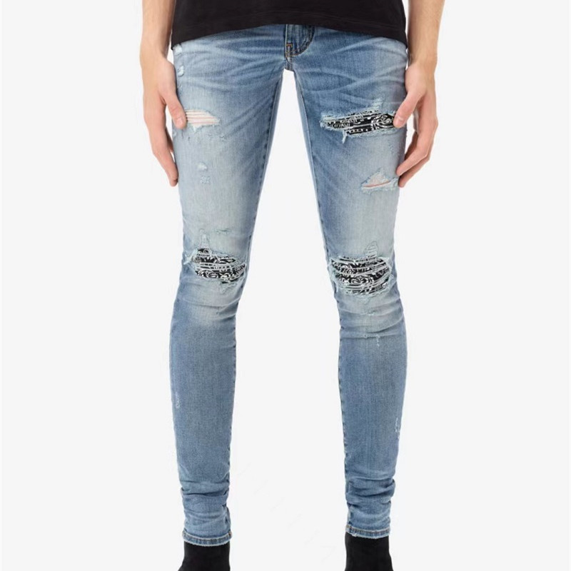 Cashew Flower Printed Patch Slim Fitting Light Colored Jeans For Men